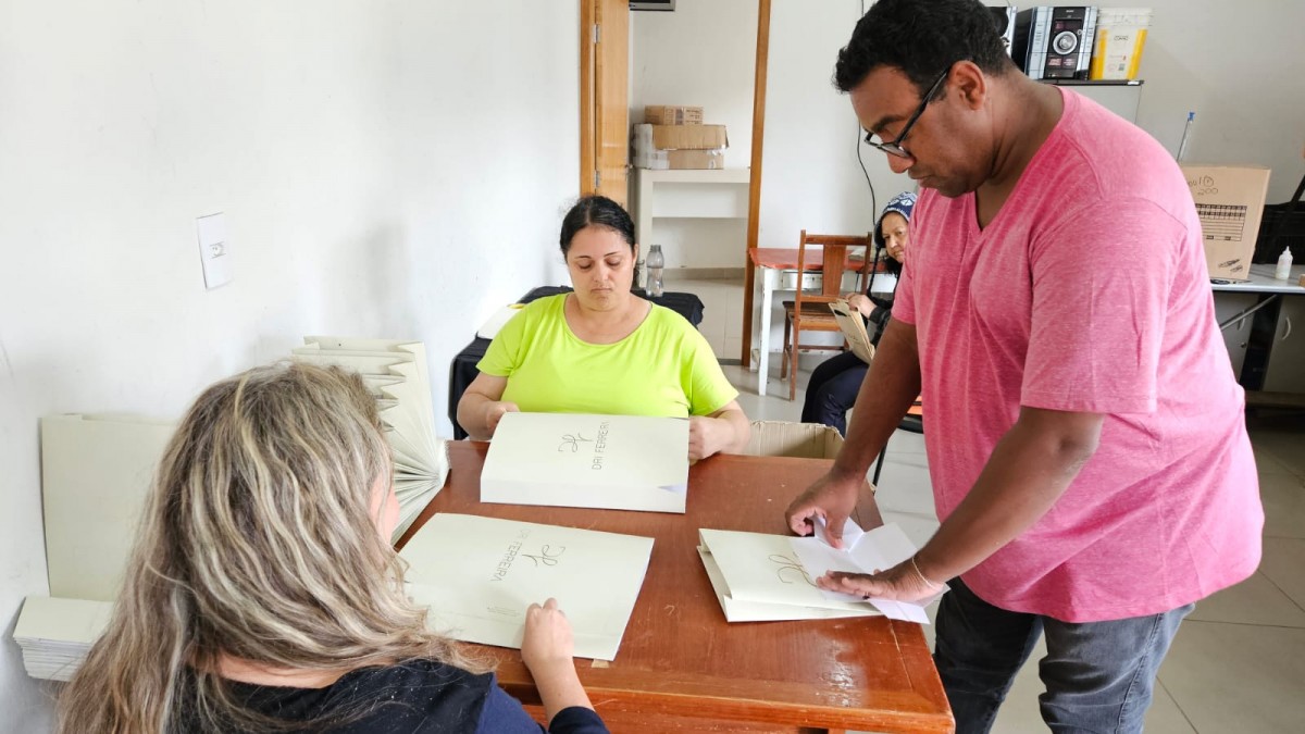 A transição trouxe vantagens importantes. Diferentemente dos produtos em couro, que dependiam da venda, a nova atividade funciona como prestação de serviço, com pagamento por unidade de sacola produzida. Isso garante retorno financeiro imediato aos oficineiros e abre espaço para atender um número maior de clientes, especialmente gráficas que buscam terceirizar a montagem das sacolas.